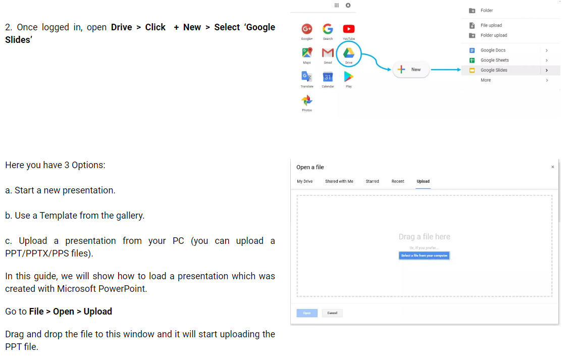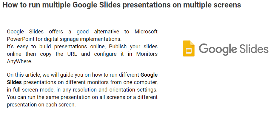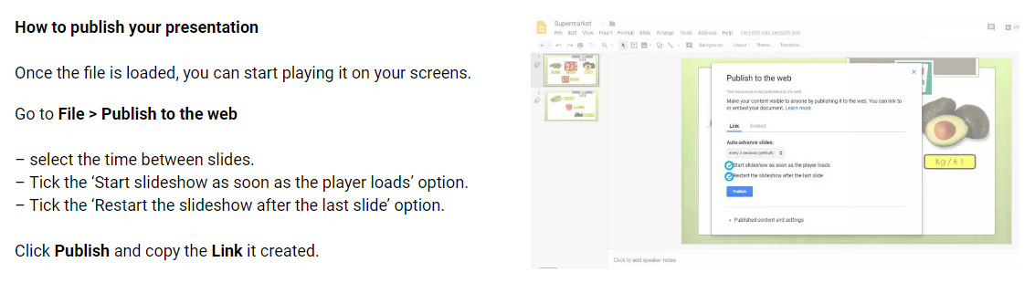 Play Google Slides presentations on multiple screens 1. Create a Google Slide presentation 2. Publish it (File > Publish to the web) – select the time between slides. – Tick the ‘Start slideshow as soon as the player loads’ option. – Tick the ...