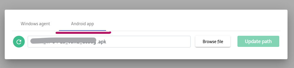 Select the Android app tab > Click on the Browse file and select the latest APK version > Update path