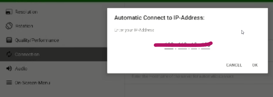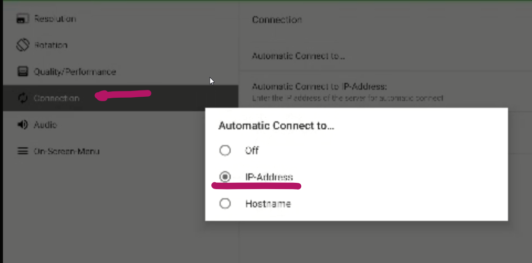 3. In the Connections menu, select the Automatic Connect to - IP Address: