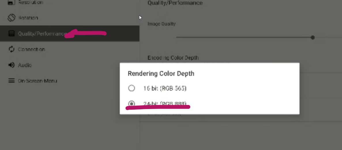 2. In the Quality and Performance menu, select the Rendering Color Depth and set it to 24bit: