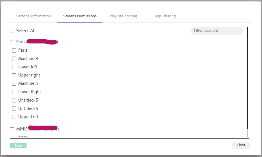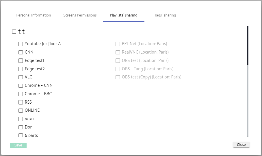 In the "Playlist Sharing" tab, you have the option to share any of the playlists you've created with other users within the system.