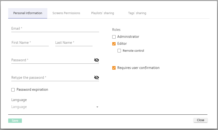 Roles | - Administrator: Granted full access to all screens and administrative management consoles. - Editor: Limited access to only those screens assigned by the system's administrator. - Remote Control: Option to enable or disable remote control capabilities for a screen within the system. |