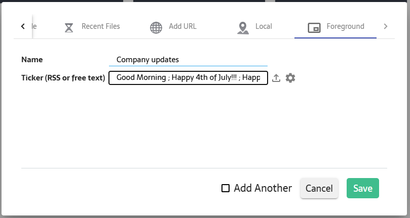 Whether you want to display a news ticker, highlight safety alerts, show promotional messages, or include a real-time clock, the Foreground feature enables this without altering your original playlist layout. This feature is applied at the playlist level, meaning any screen playing that playlist will display the ticker or foreground overlay in real time.